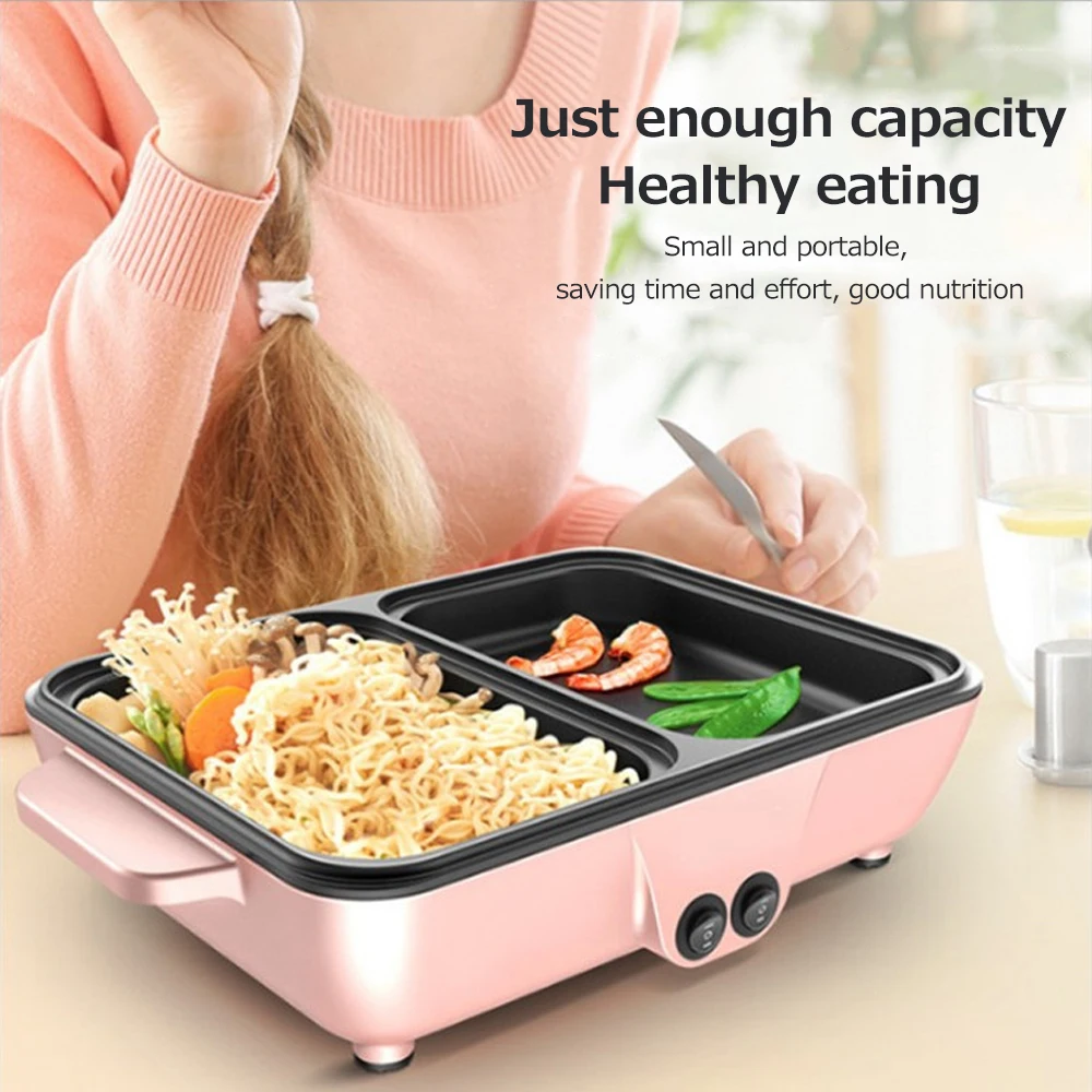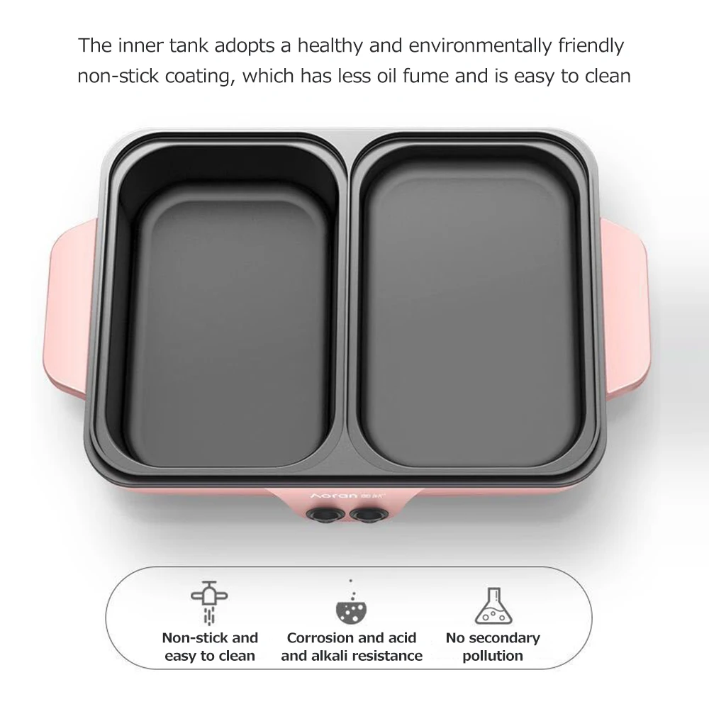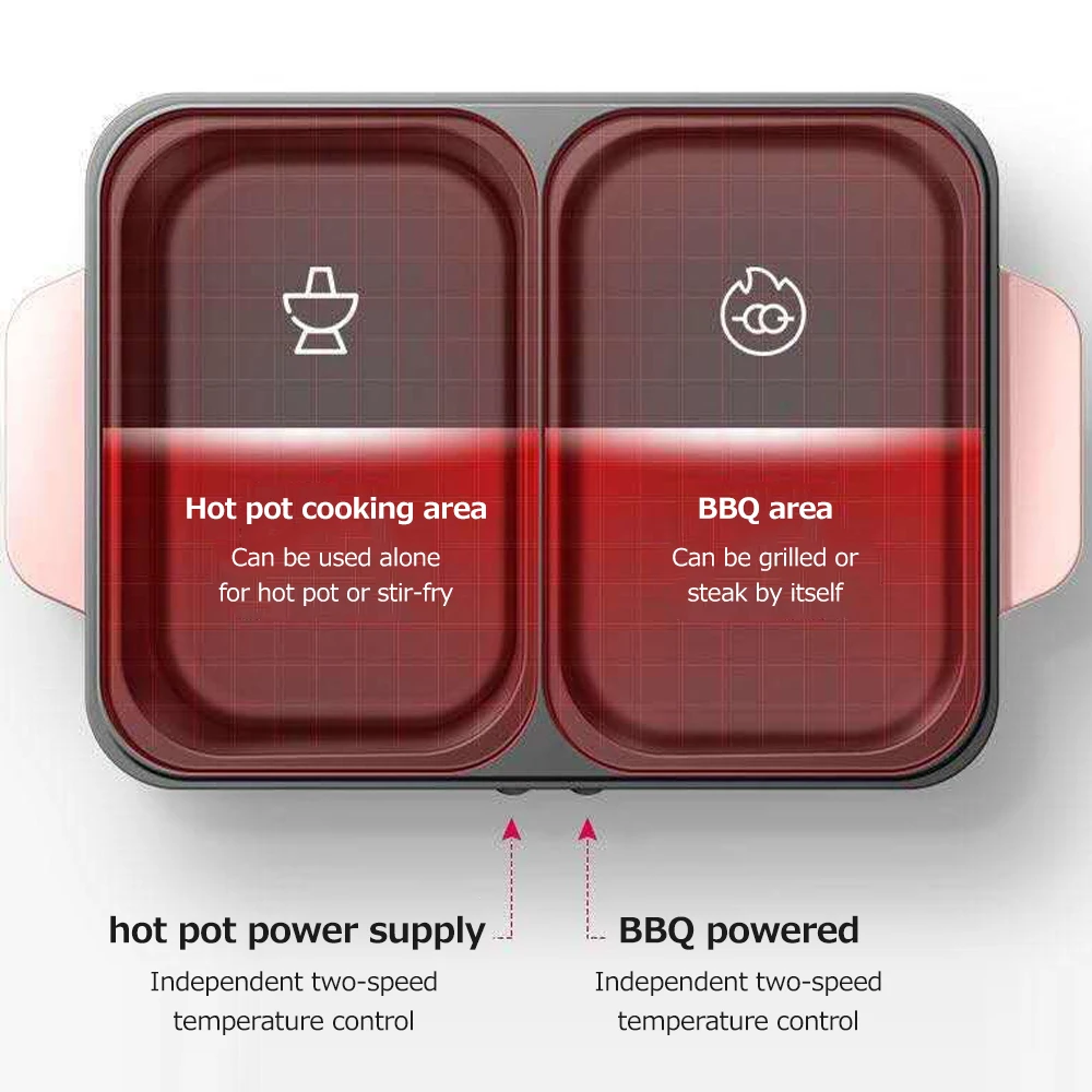 5. يعتمد هذا الوعاء ذو الاستخدام المزدوج على طاقة W ، بحيث يمكن التحكم بدرجة حرارة الوعاء الساخن ودرجة حرارة الشواء بشكل مستقل ، مما يوفر الجهد والوقت. يمكنك اختيار إعدادات التدفئة بشكل منفصل ، زر واحد للوعاء الساخن ، والآخر للشواء.