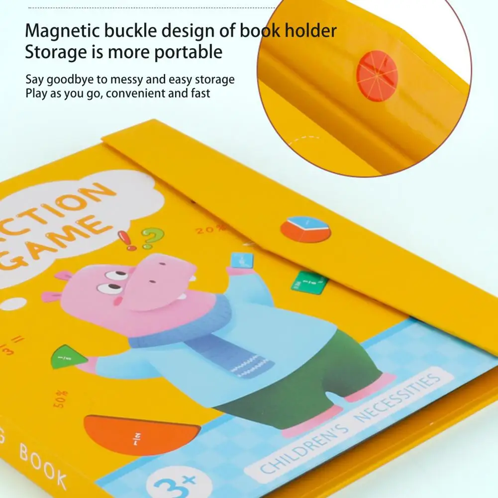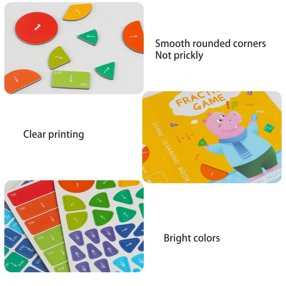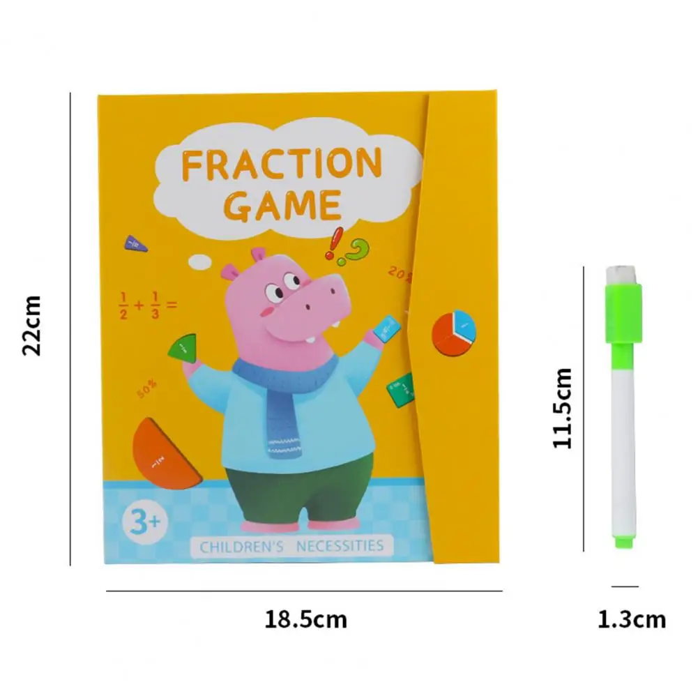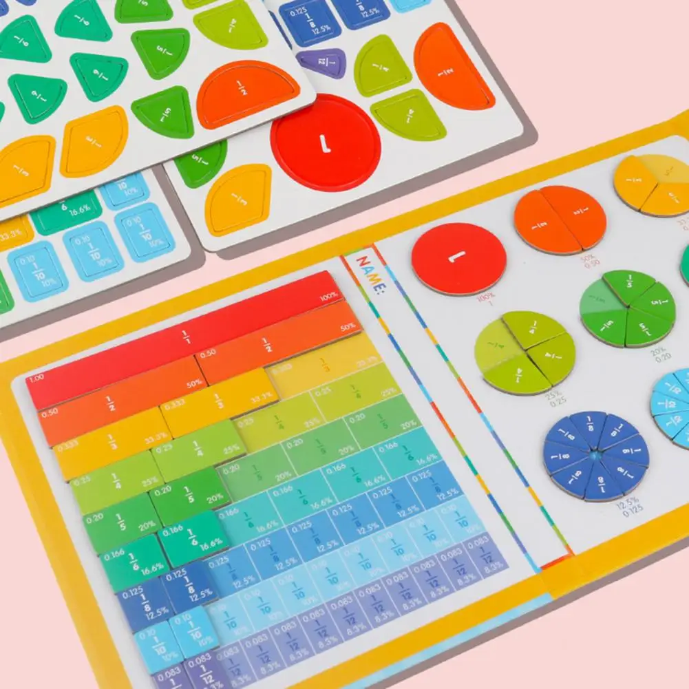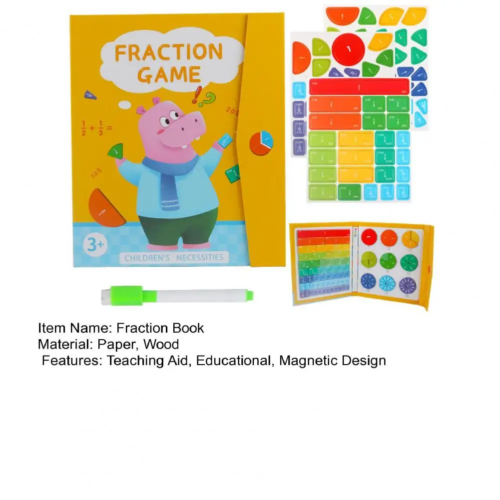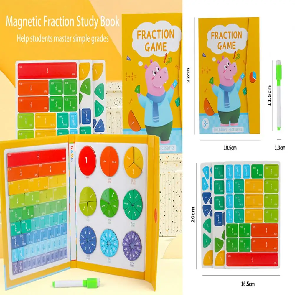 يتضمن كتابًا مغناطيسيًا ، وكتل تمثل كسور دائرية وشريط ، وقلم قائم على الماء قابل لإعادة الكتابة لخيارات التدريس المتعددة الاستخدامات.
